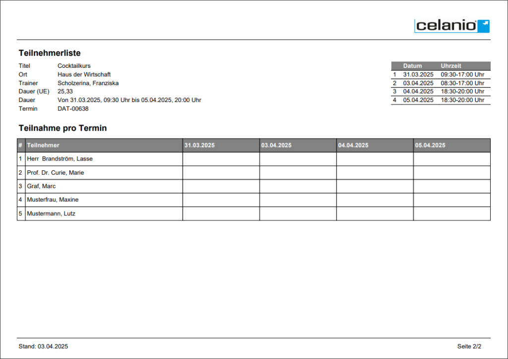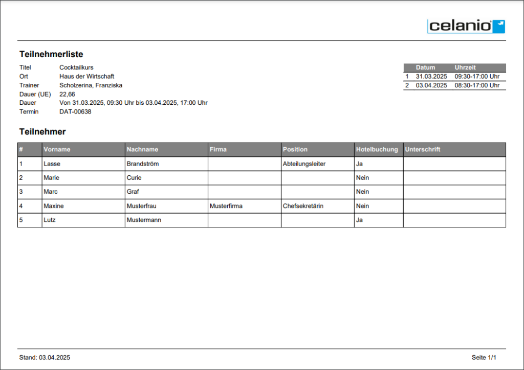 celanio – deine Software für Seminarmanagement hat natürlich auch hier eine Lösung für dich bereitgestellt. Da wir eine hohe Priorität darauf legen, dass du deine Prozesse hier exakt abbilden kannst, haben wir eine Teilnehmerliste geschaffen, die mit wenig Aufwand genau auf deine Bedürfnisse angepasst werden kann.