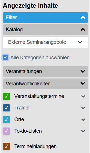 Natürlich kannst du auch über den Filter vor jeder Suche, den Katalog, die Katalogkategorie und die Veranstaltungsstämme, aus denen die Daten entnommen werden, eingrenzen.