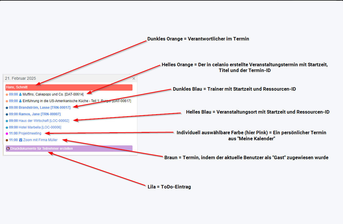 Anhand der Farbe des jeweiligen Punktes oder des Hintergrundes kann eine Zuordnung auf einen Blick geschehen. Über eine Option kannst du im Projekt selbst auswählen, welche Farbe die Termine, die Orte, die Trainer und die To-do’s haben sollen.  Hierbei ist es wichtig zu wissen, dass ein Punkt bedeutet, dass dieser Termin eine zeitliche Eingrenzung hat. Sollte ein Termin einen Hintergrund haben, bedeutet dies, er ist ganztägig, bzw. er findet über mehrere Tage statt.