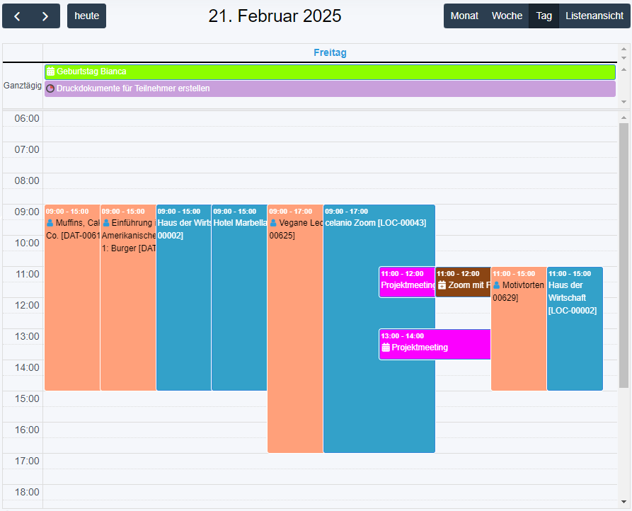 In der Kalenderübersicht hast du die Möglichkeit, dir alle Einträge in Monats-,Wochen-, Tages- oder Listenansicht anzeigen zu lassen. Eine Tagesansicht könnte zum Beispiel wie folgt aussehen: