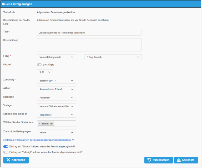 Nun wird ein To-do-Eintrag erstellt, dem wir diese Vorlage hinterlegen. Wir stellen ein, wann der automatische Versand stattfinden soll. In unserem Beispiel, einen Tag nach Ende der Veranstaltung. Außerdem definieren wir hier, dass die E-Mail nur an Teilnehmer versendet wird, welche im Status „nimmt teil“ sind.